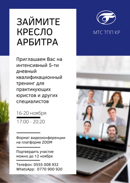 Онлайн тренинг «Ведение дела в Международном Третейском суде при Торгово-промышленной палате Кыргызской Республики» пройдет с 16 по 20 ноября 2020 года с 17.00 до 20.20 в формате видеоконференции в ZOOM.